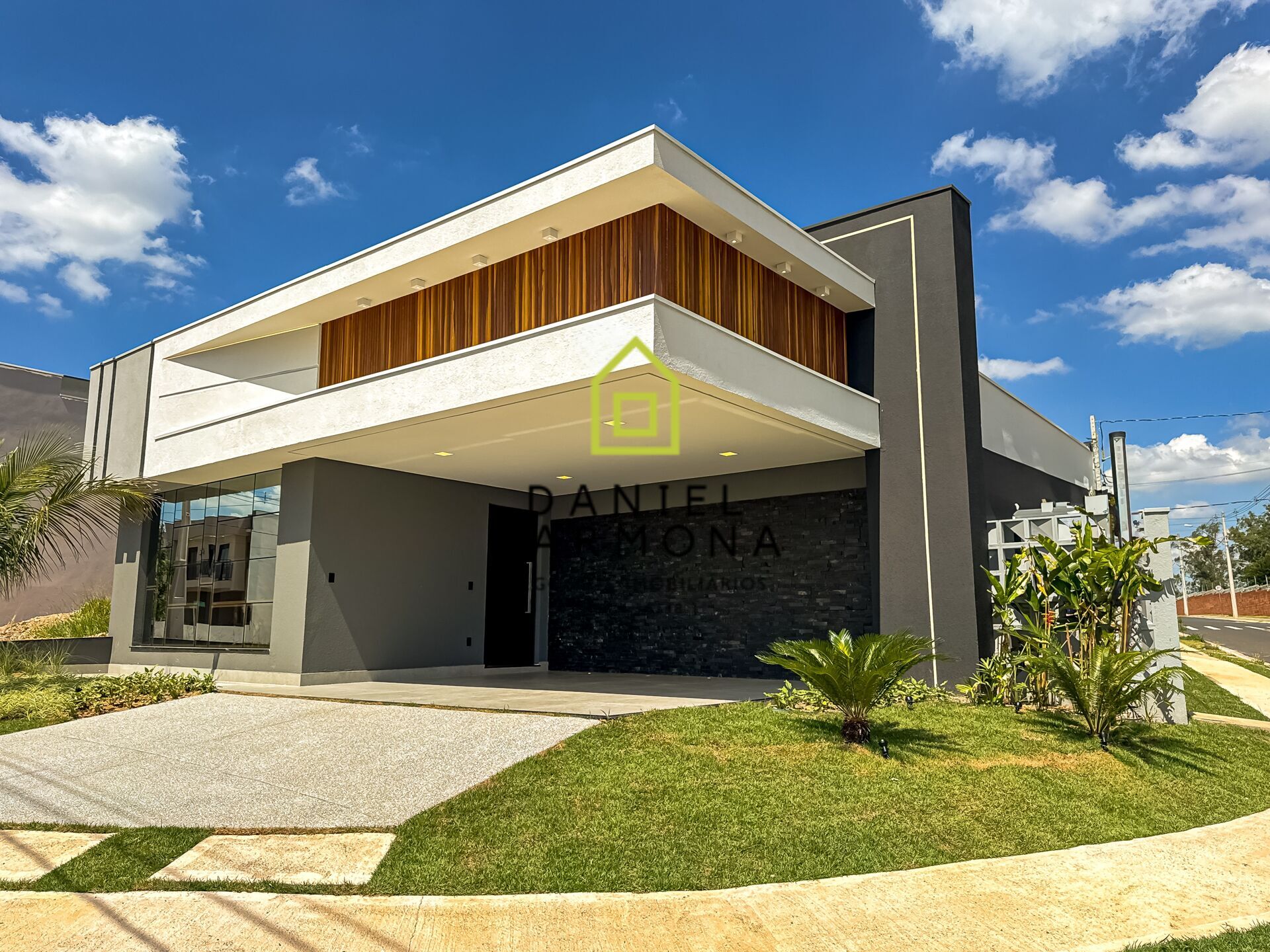 - Fachada com revestimentos, detalhes em madeira e janela em pele de vidro;